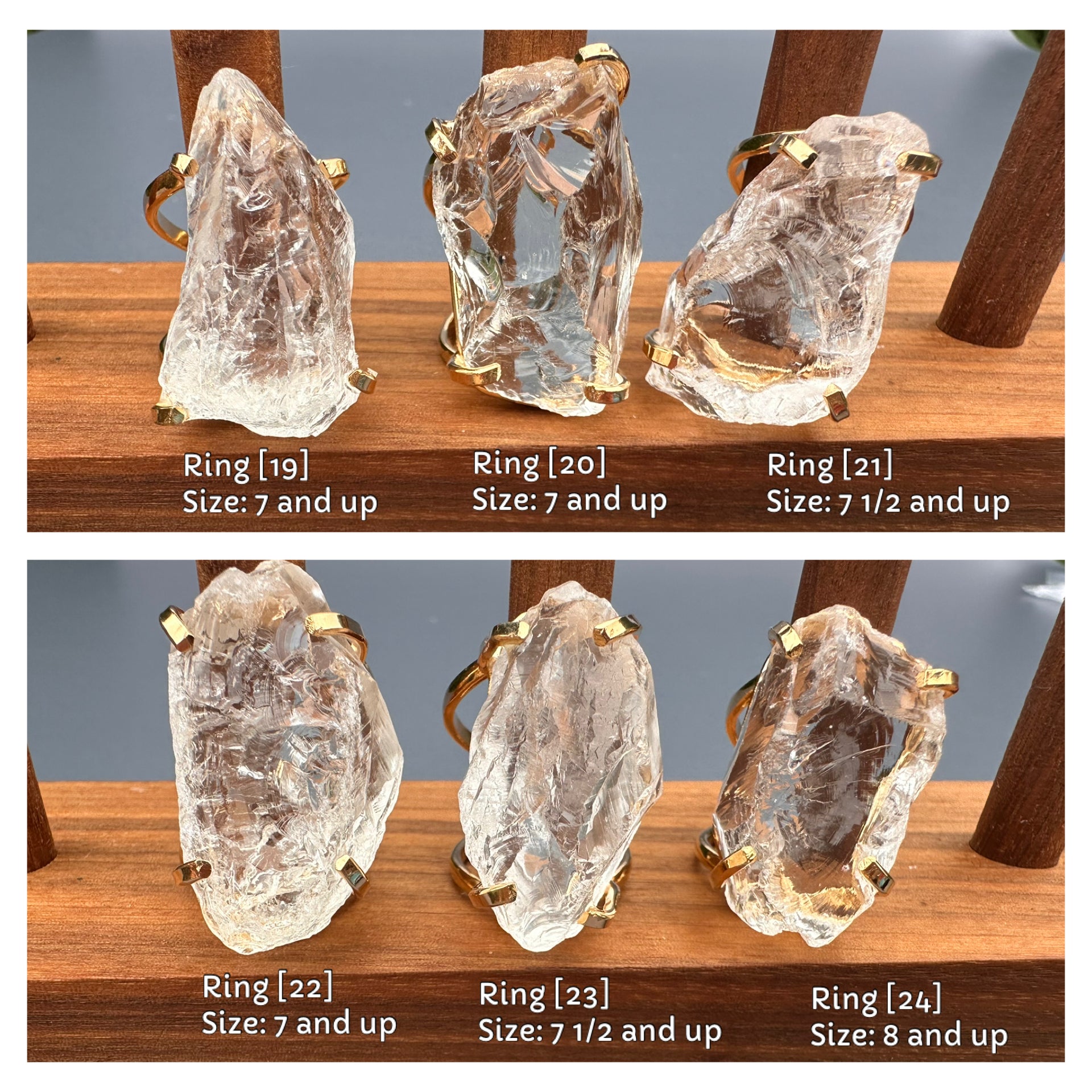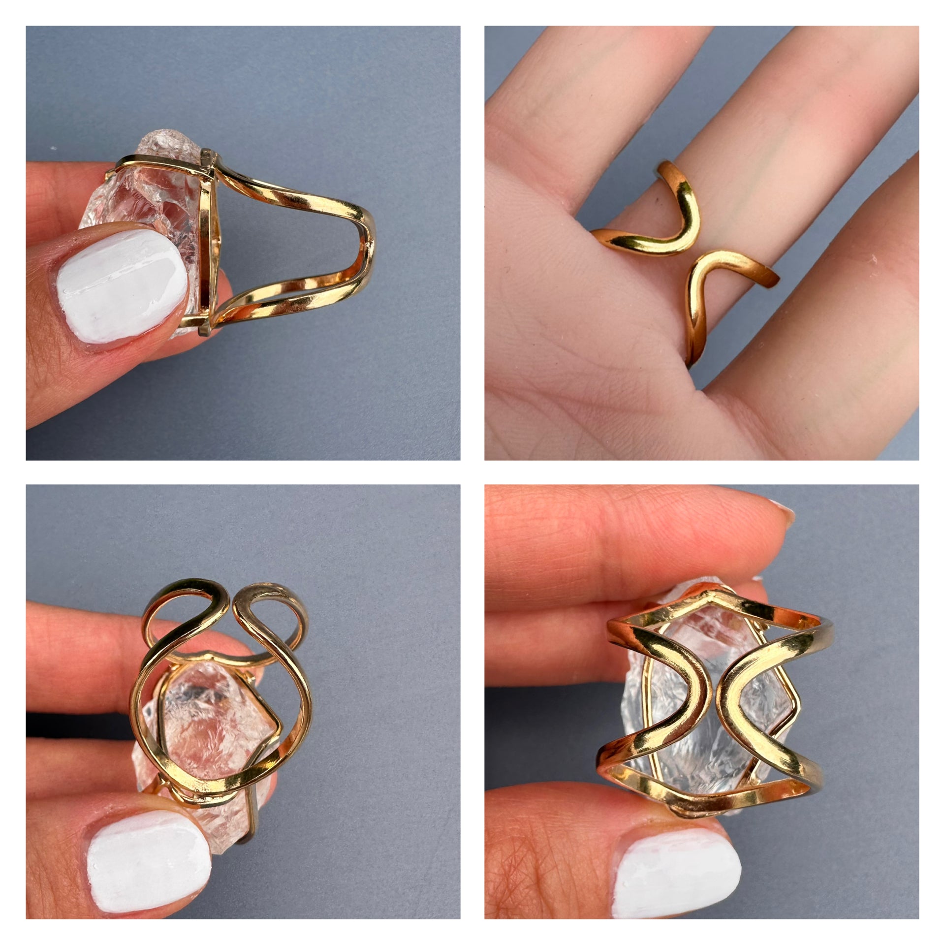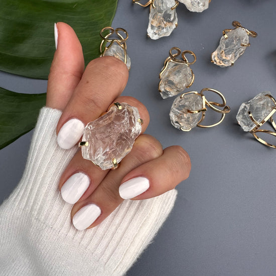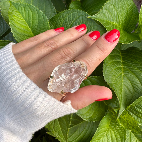 Gemstone: crystal quartz Gemstone shape: rough Gemstone source: natural Gemstone mining country: Brazil Crystal size: ~ 3 cm - 3.5 cm Band material: 18 karat gold plated brass Ring band size: adjustable Comes with a designer box