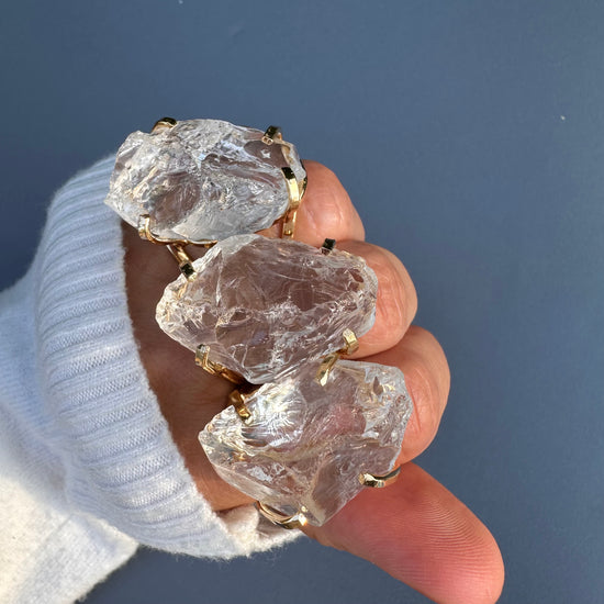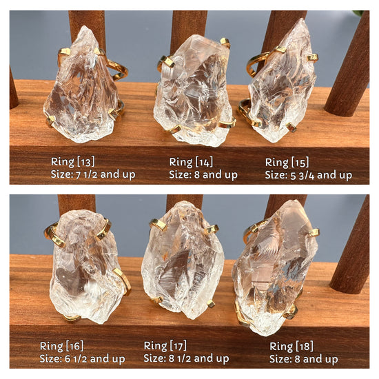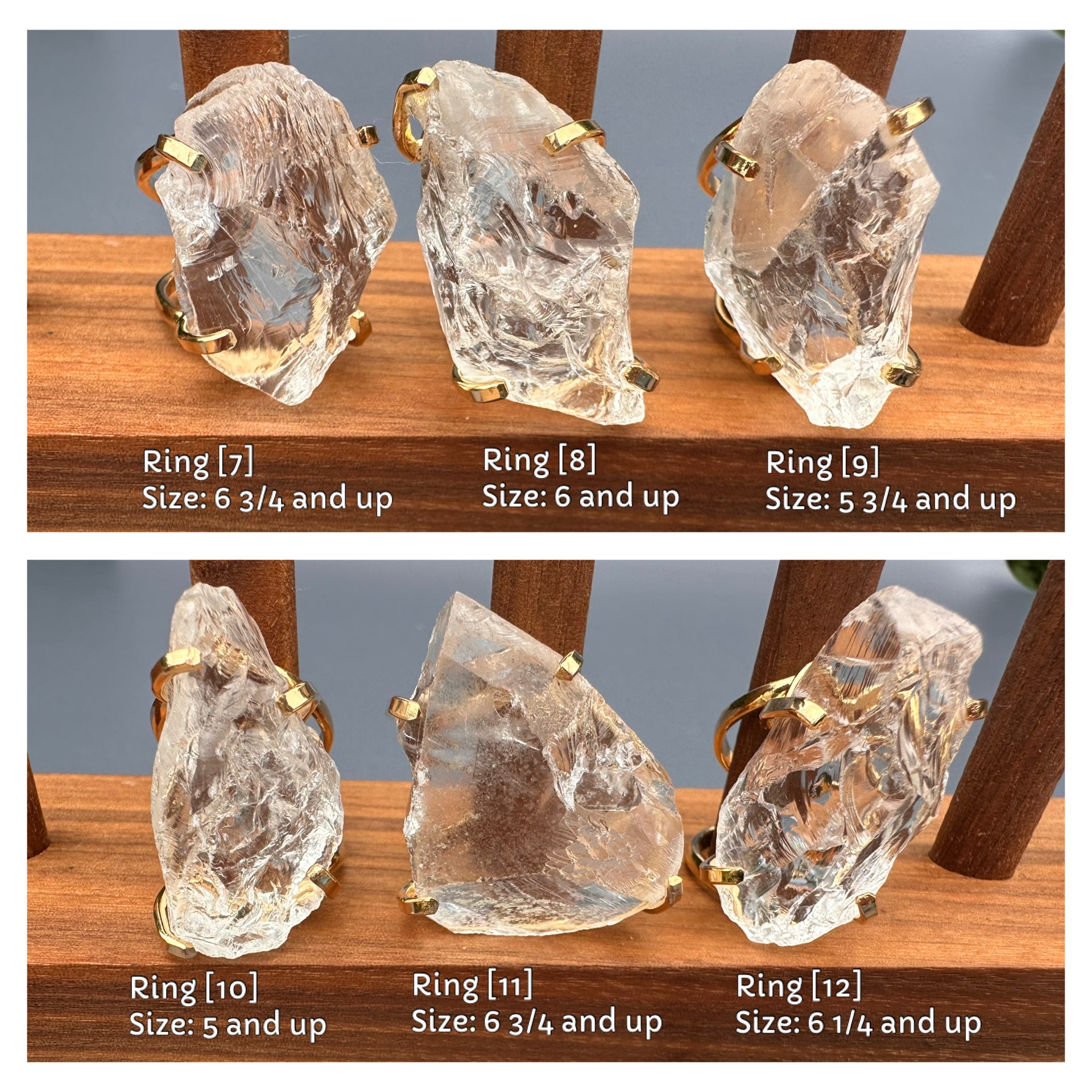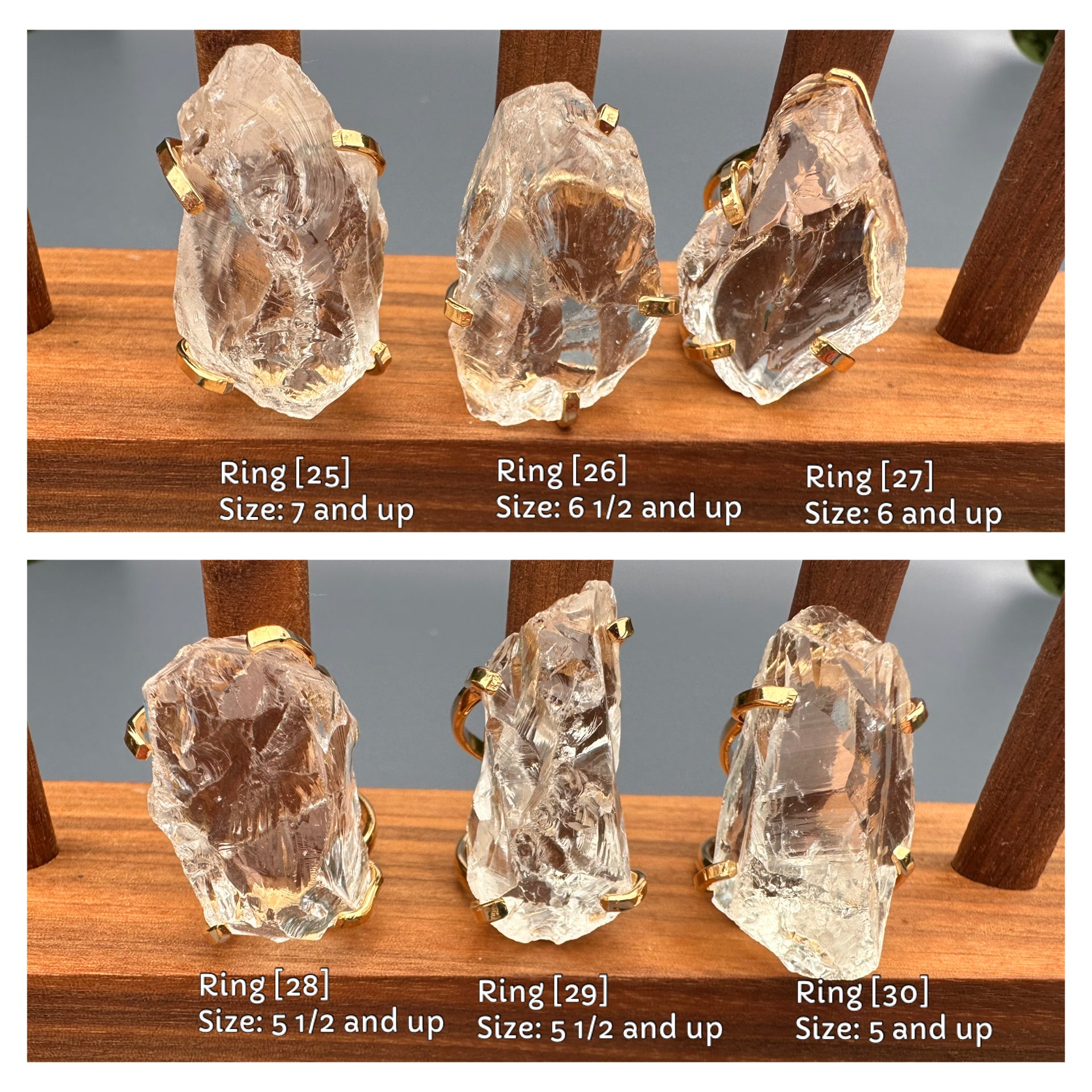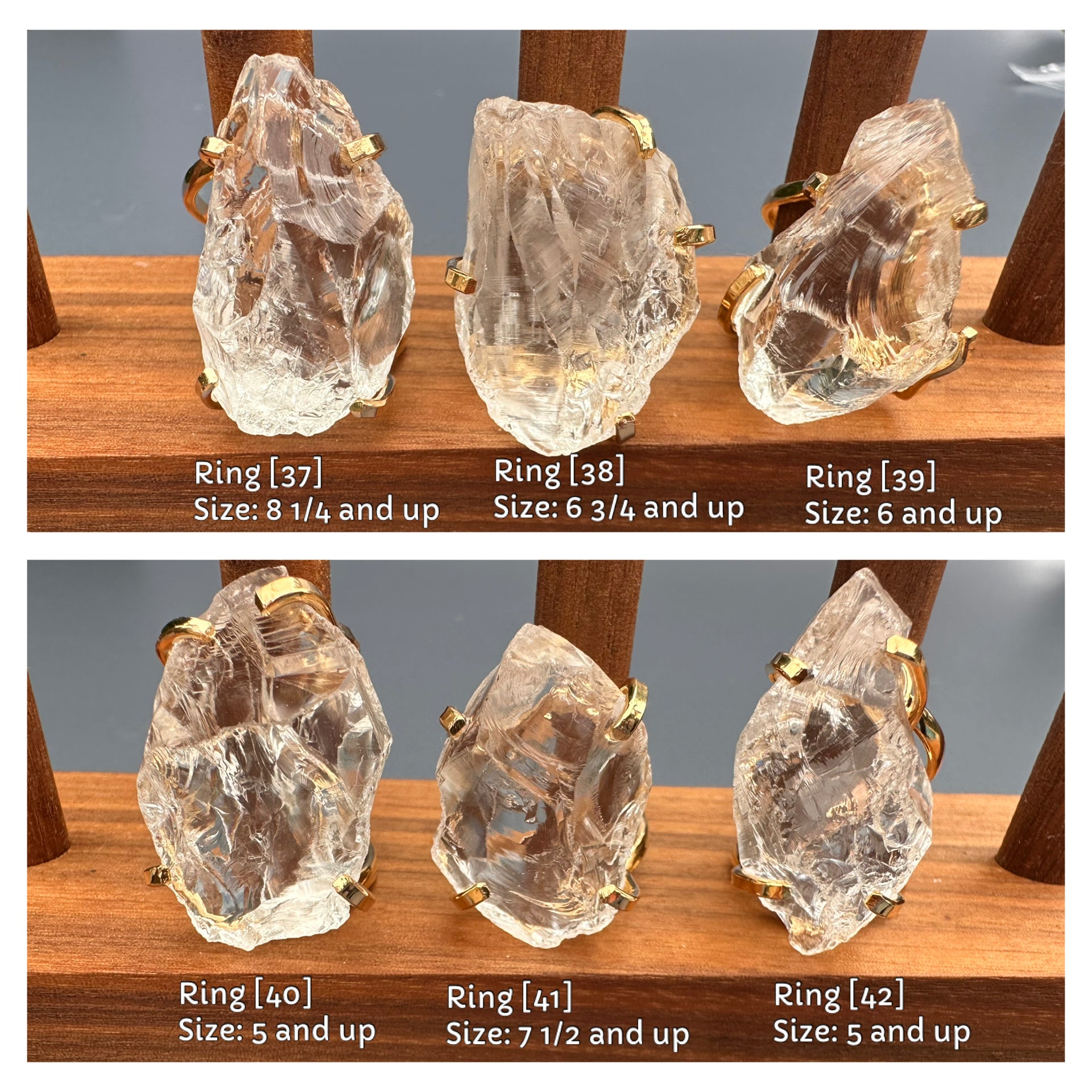 Gemstone: crystal quartz Gemstone shape: rough Gemstone source: natural Gemstone mining country: Brazil Crystal size: ~ 3 cm - 3.5 cm Band material: 18 karat gold plated brass Ring band size: adjustable Comes with a designer box